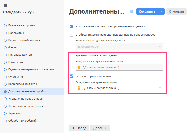 Реализованы настройки на странице «Дополнительные настройки» в мастере стандартного куба: